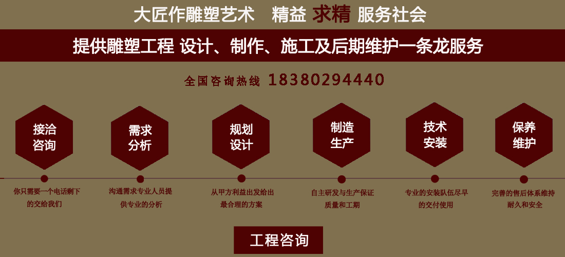 成都大匠作雕塑有限公司,是經(jīng)成都工商局審定注冊的正規(guī)專業(yè)雕塑制作及工程安裝服務(wù)機構(gòu),是由一群年輕富有朝氣的年輕人創(chuàng)辦,發(fā)軔于四川省成都市龍泉驛區(qū)。它是一家******于創(chuàng)作、制作和銷售為一體的公司。大匠作擁有多年從事公共藝術(shù)的專業(yè)人員和雕塑制作人組成的核心團(tuán)隊,為您提供專業(yè)、具創(chuàng)新的設(shè)計及制作服務(wù)。公司成立以來,秉承“******服務(wù)、誠信為本”的宗旨,以客戶需求為目標(biāo)導(dǎo)向,不斷學(xué)習(xí),進(jìn)取,優(yōu)化和提高服務(wù)質(zhì)量,公司向您******——“您的滿意***是我們的信譽”,我們將以飽滿的熱情和******的服務(wù)贏得您的贊譽和支持。